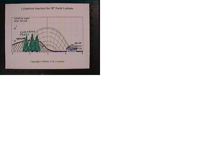 | Figure 1 shows a typical cylindrical sunchart for 50 degrees north latitude. |